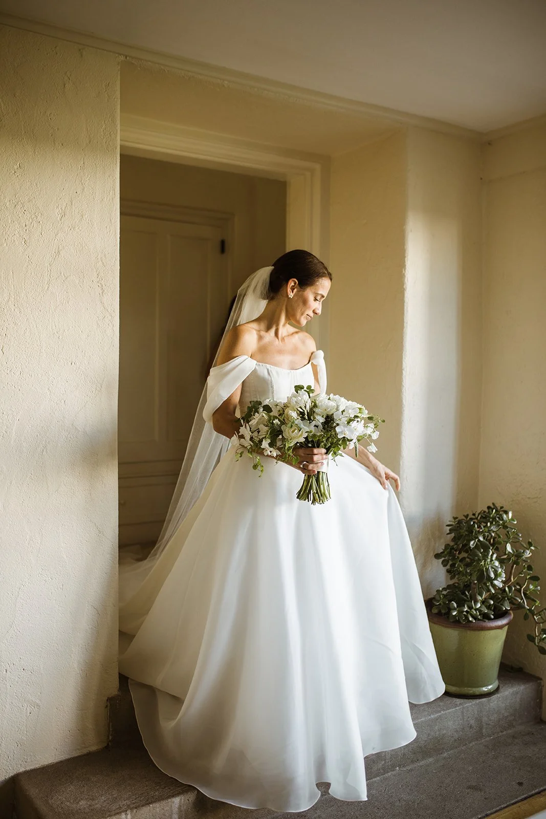 Bride Alex’s Monique Lhullier silk organza wedding gown was straight out of a storybook. A simple but beautifully crafted A-line bridal dress with a corset style bodice, draping off the shoulder sleeves, and long train is fit for any fairytale princess. A long bridal veil and a bouquet of white blooms and greenery completed her elegant bridal style. Groom Alex completed the bride’s elegant style in a classic black tuxedo.