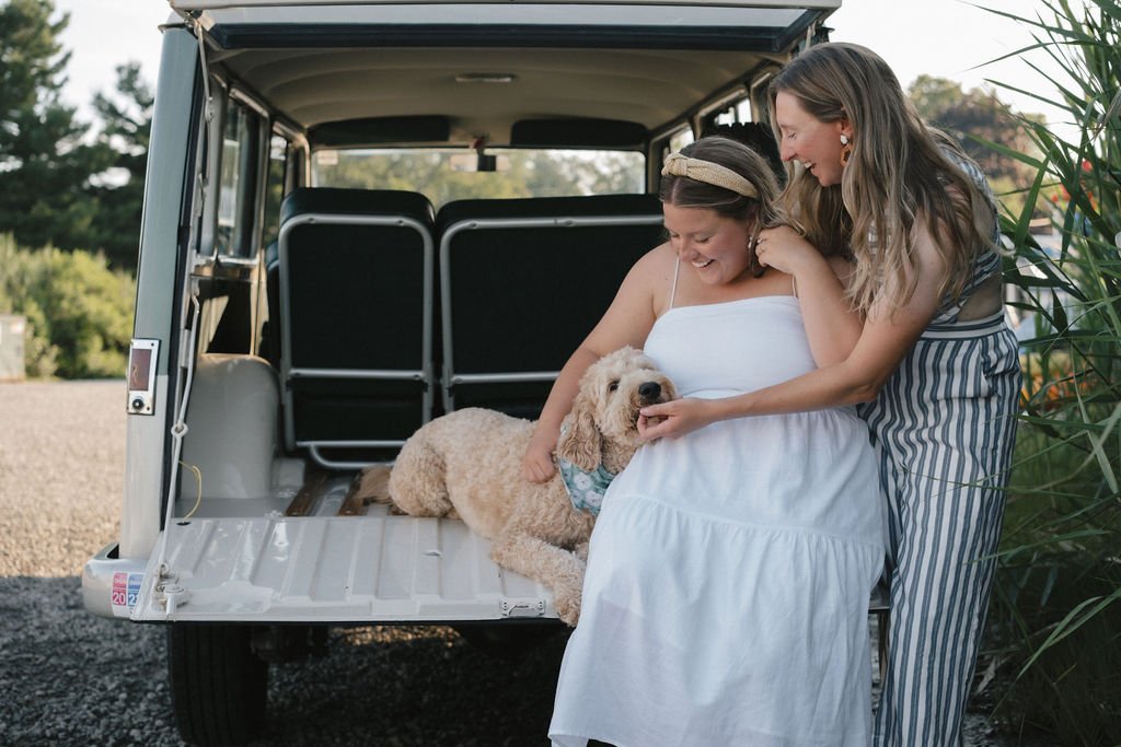 This fun coastal wedding engagement photo session was the perfect way for these brides to celebrate this time in their lives. We started the session with a vintage Land Cruiser that fit right in. The photographer captured some beautiful candid moments between Meghan and Sarah.